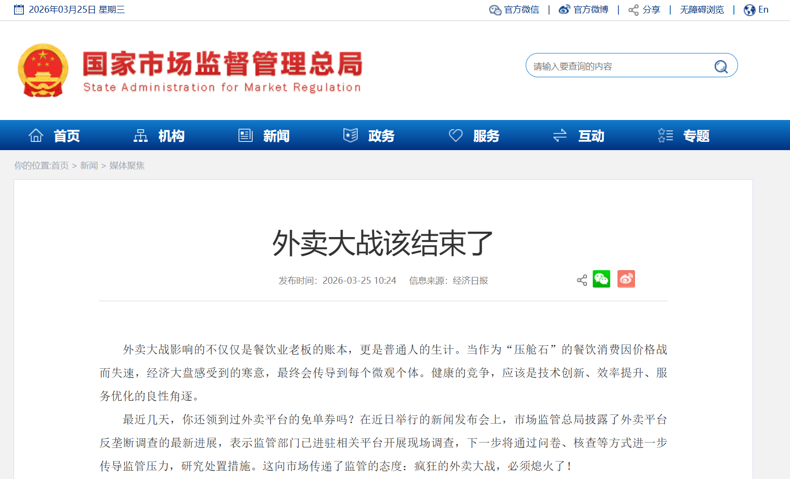 3月25日,国家市场监管总局官网转载评论文章《外卖大战该结束了》。文章直言,外卖大战冲击餐饮行业,拖累消费回暖的大趋势,影响餐饮业老板的账本和普通人的生计,监管及时叫停外卖大战,其实是在维护经济正常运行。